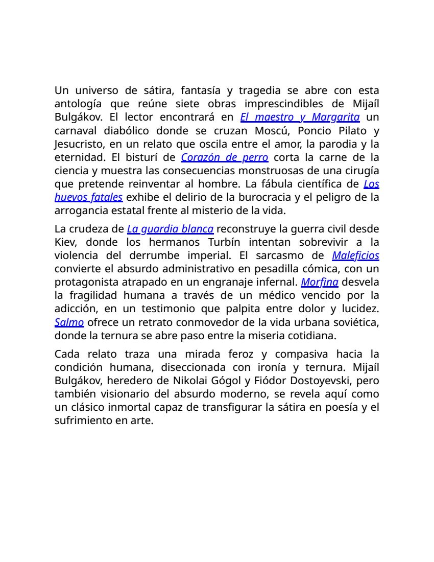Un viaje inolvidable por las luces y las sombras del siglo XX se despliega en Entre la sátira y la fe: Antología esencial de Mijaíl Bulgákov. Esta colección reúne siete obras imprescindibles que muestran la amplitud, la valentía y la profundidad de un escritor perseguido en vida y reverenciado tras su muerte.