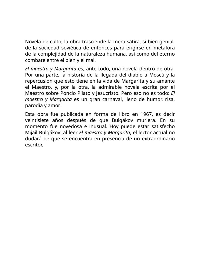 En El maestro y Margarita la irrupción de Woland, un diablo irónico y elegante, convierte Moscú en escenario de prodigios y desastres. Allí conviven escritores sometidos a la censura, funcionarios arrogantes, amantes condenados a la locura y la figura de Poncio Pilato, atormentado por su cobardía. La novela oscila entre la sátira política, la fábula fantástica y la meditación metafísica, convirtiéndose en un hito literario universal.
