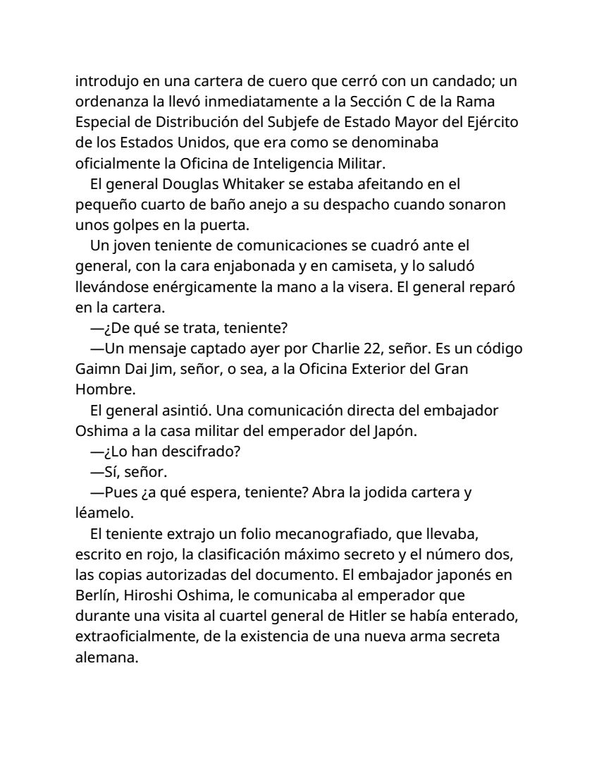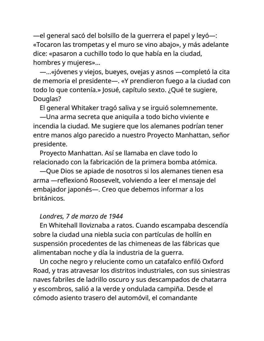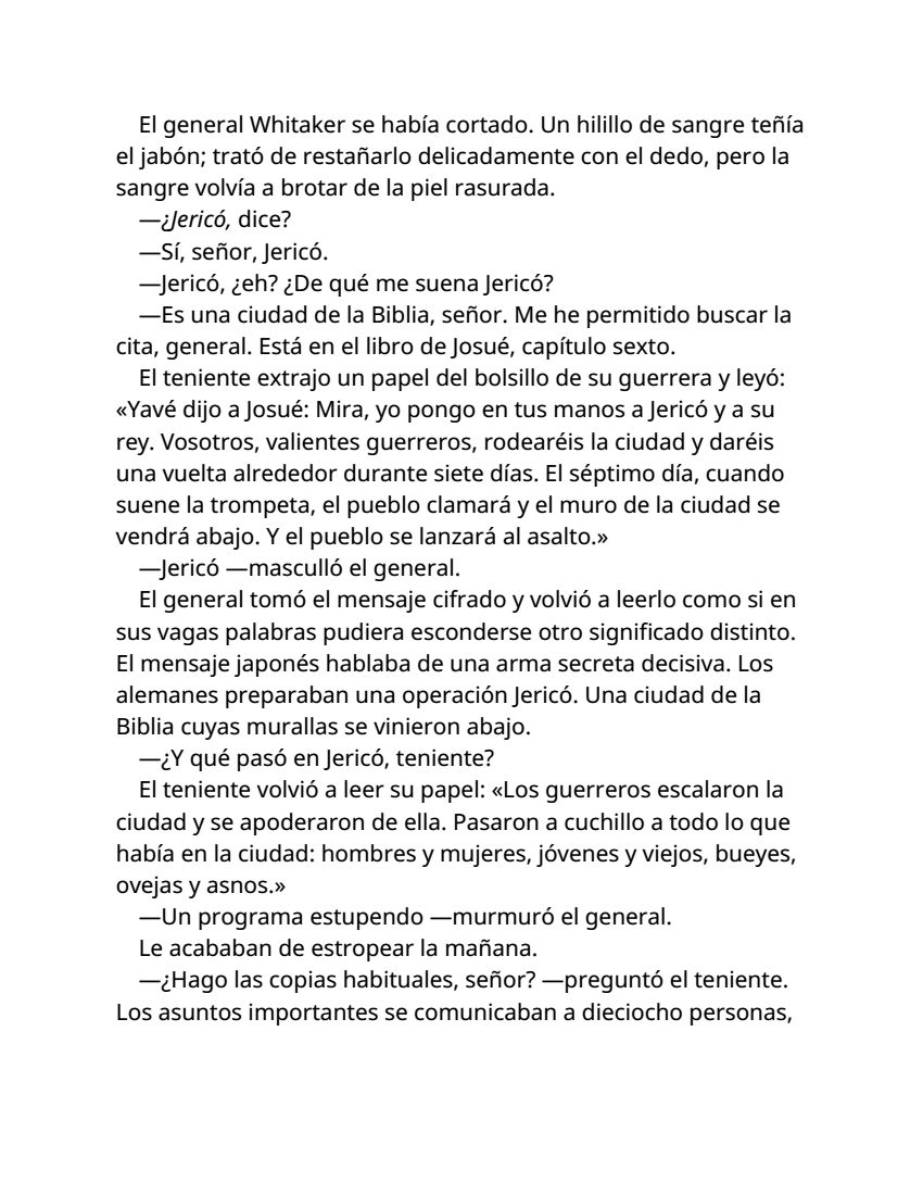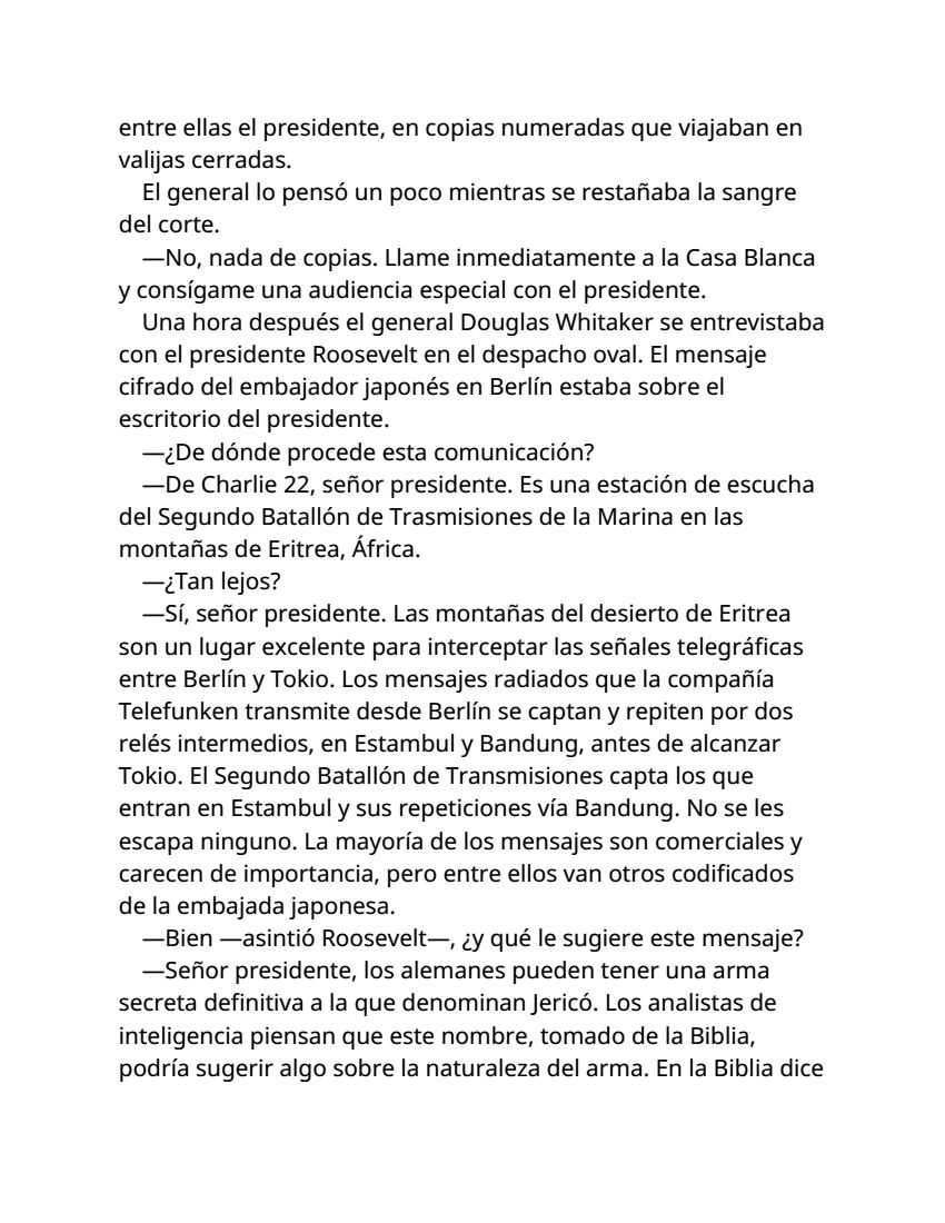 Mientras tanto, en el otro lado del mundo, los servicios de inteligencia de Estados Unidos, Japón y Gran Bretaña empiezan a detectar algo turbio. Mensajes cifrados desde Eritrea, telegramas japoneses desclasificados, informes de criptografía… La palabra «Jericó» aparece demasiado, y siempre asociada a un “arma definitiva”. El presidente Roosevelt y Churchill comprenden que algo muy serio se está moviendo. Nadie menciona el Arca, pero los analistas conectan los puntos: si los nazis están a punto de obtener un arma equivalente al Proyecto Manhattan, el mundo podría entrar en una oscuridad de la que jamás saldría.