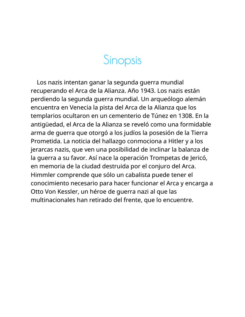 Corre el año 1943. Alemania está perdiendo la guerra, sus ciudades arden y la maquinaria bélica muestra grietas cada vez más profundas. Es justo entonces cuando surge una pista inesperada en la ciudad de Venecia: el Arca de la Alianza, el arma legendaria que según el Antiguo Testamento derribó murallas, desató fuego divino y entregó territorios enteros a un pueblo elegido. Aquello que los templarios ocultaron en 1308, en un cementerio remoto de Túnez, podría ser real… y podría estar al alcance del Reich.