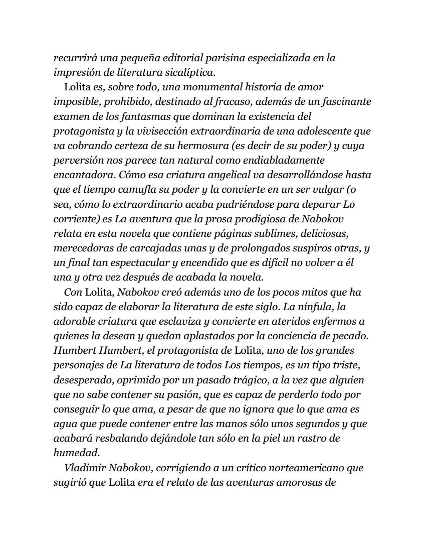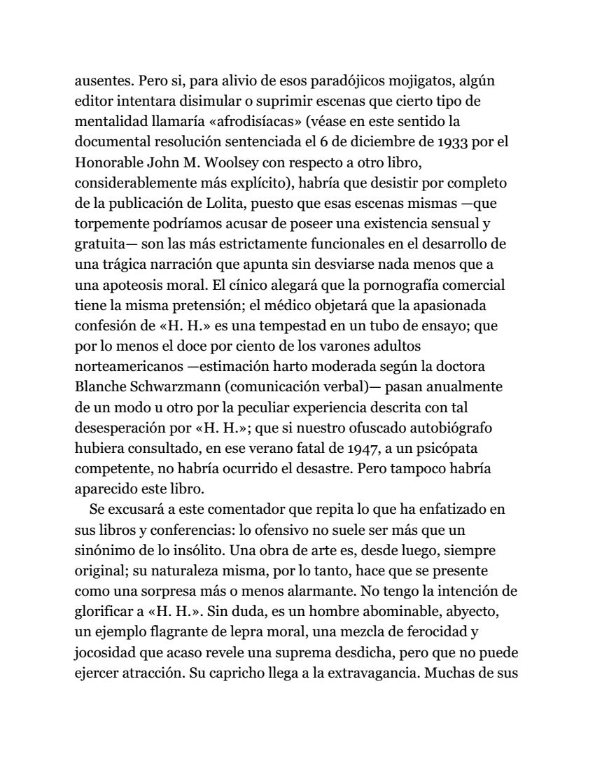 Como novela, Lolita no se esconde tras evasivas: no encontrarás palabras obscenas, aunque muchos lectores modernos se sorprendan de su ausencia. Si algún editor, por pudor calculado, quisiera recortar las escenas que un cierto tipo de mente llamaría “afrodisíacas”, destruiría el esqueleto mismo de esta historia. Esos momentos, lejos de ser gratuitos, empujan la narración hacia una culminación moral. El cínico dirá que eso también lo afirma la pornografía comercial; el médico añadirá que lo relatado es una tormenta dentro de un frasco de vidrio. Doce de cada cien hombres, asegura cierta doctora, han sentido algo semejante. Quizá, de haber buscado ayuda en aquel verano de 1947, nada habría pasado… y tampoco existiría este libro.