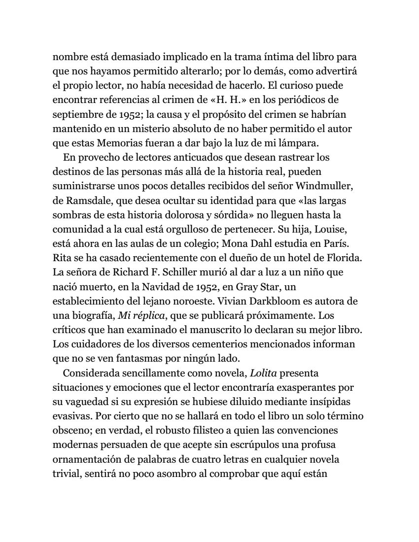 Para quienes sienten curiosidad por los destinos posteriores, contaré lo que llegó a mis oídos por boca de un hombre de Ramsdale que prefiere el anonimato. Su hija, Louise, estudia en un colegio; Mona Dahl reside en París. Rita se casó con el dueño de un hotel en Florida. La esposa de Richard F. Schiller falleció en Navidad de 1952, durante un parto que terminó en tragedia doble. Vivian Darkbloom, autora de Mi réplica, verá pronto su obra publicada, y algunos críticos ya la llaman su mejor libro. En los cementerios mencionados, nadie ha visto fantasmas.