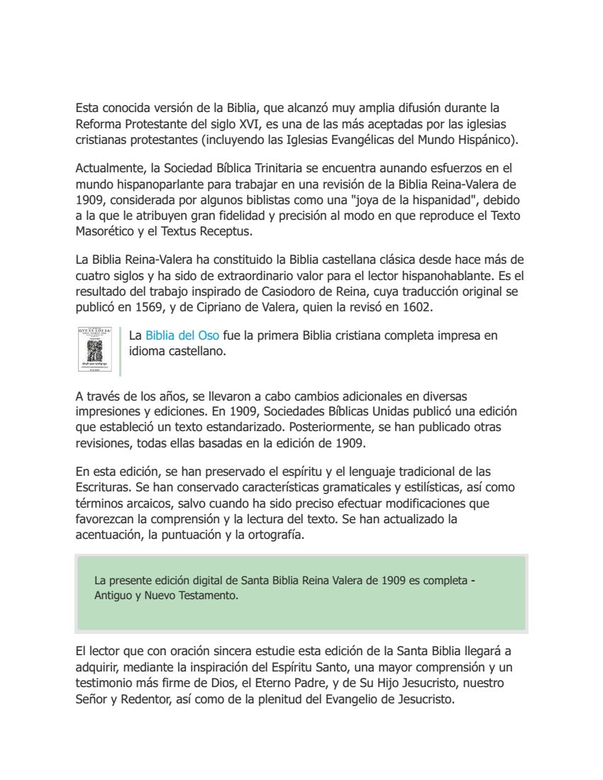 Una edición preciosa y muy fiel al texto clásico. La Reina Valera 1909 siempre ha sido mi favorita por su lenguaje solemne y su profundidad espiritual, y esta versión digital está muy bien cuidada. Se lee con claridad, mantiene el estilo tradicional y transmite esa sensación de estar conectado con siglos de historia y fe. Ideal para estudio personal y para quienes valoran la Biblia en su forma más auténtica.